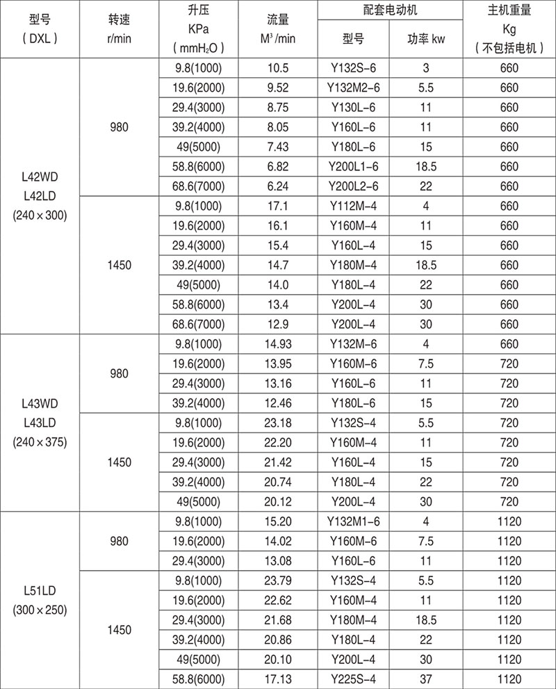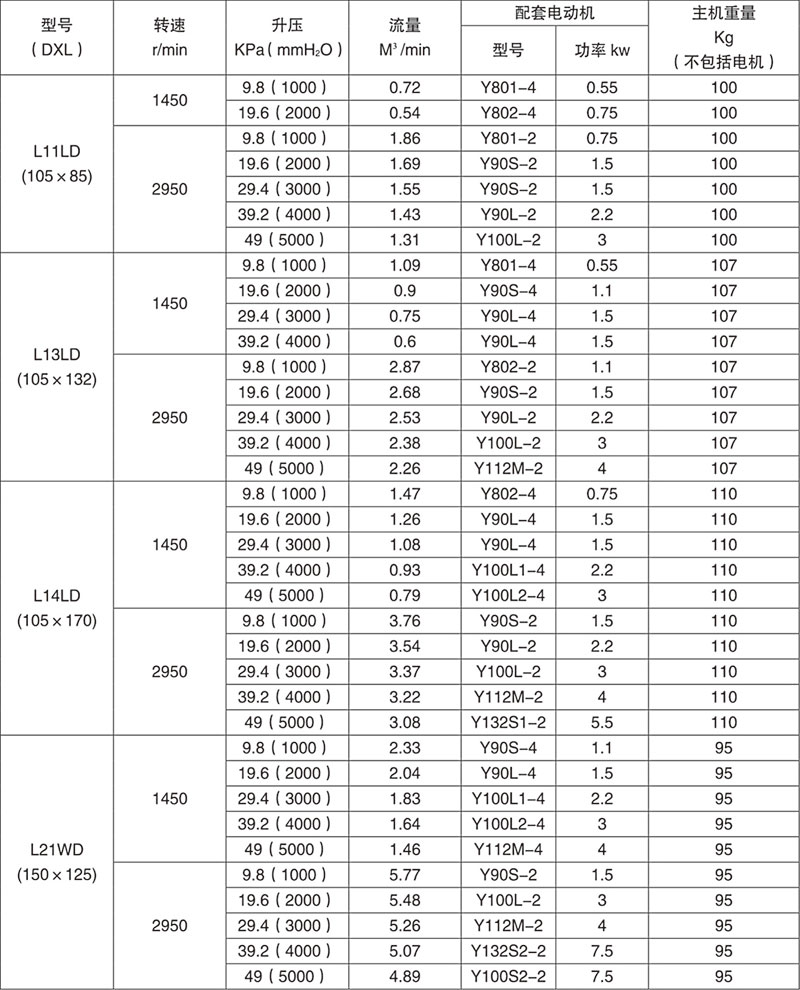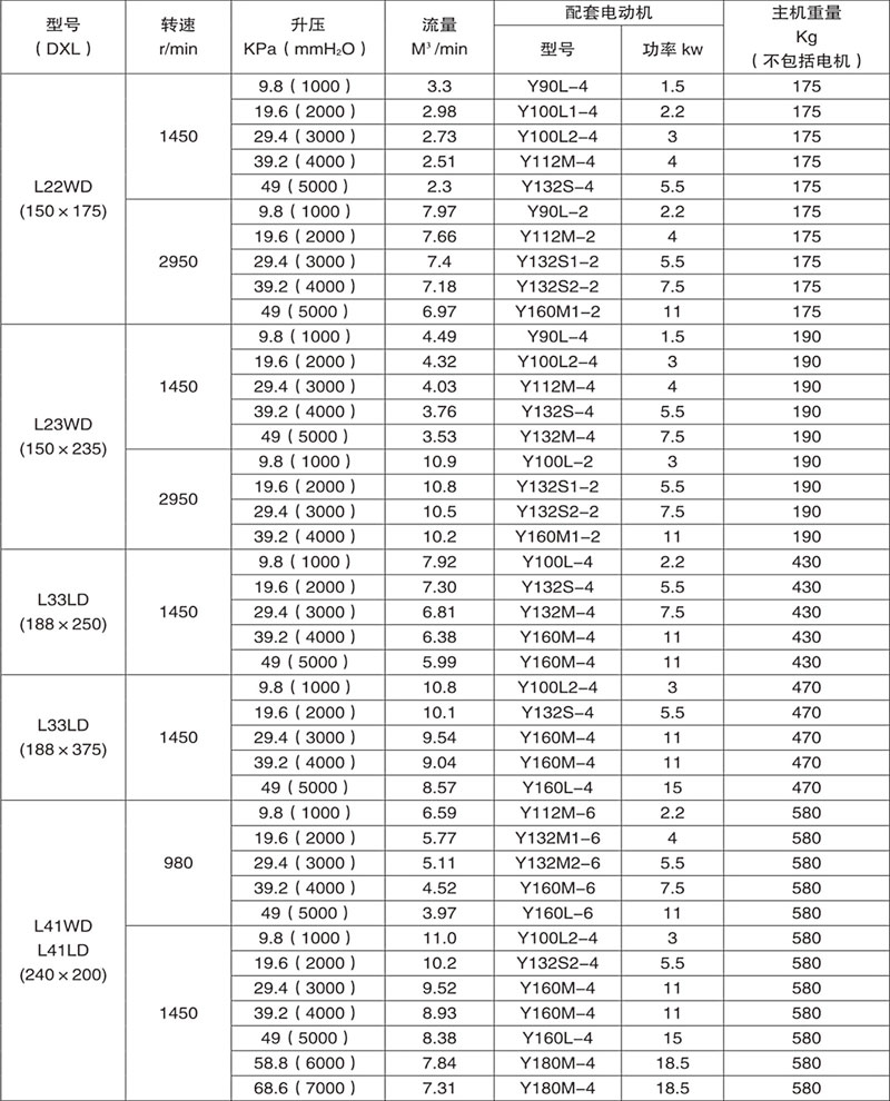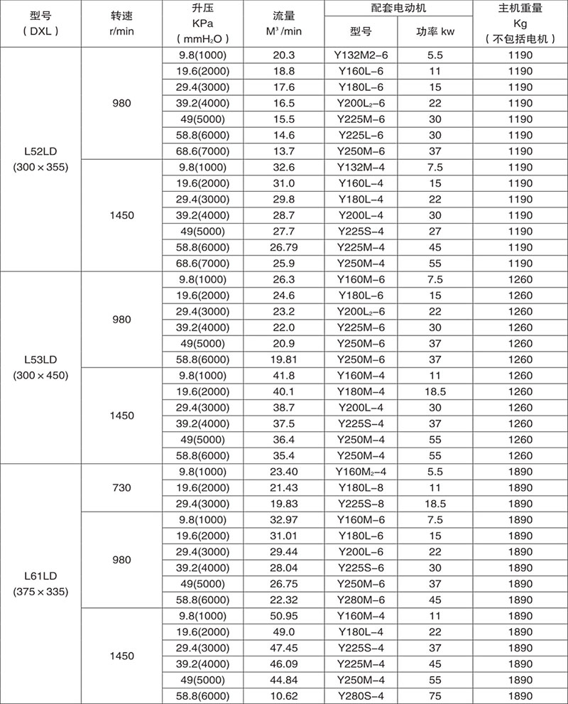 羅茨鼓風機性能參數表