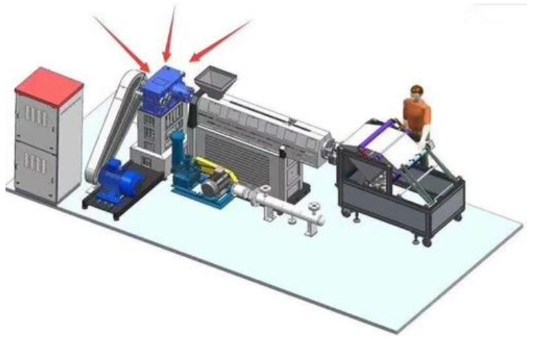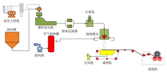 自動上料機自動吸入拉絲級聚丙稀送至擠出機,擠出機加熱熔化PP顆粒至液態。羅茨鼓風機或空壓機和儲氣罐壓縮空氣送至烘箱加熱,熱空氣通過壓力使熔化成液態的聚丙烯材料從噴頭噴射而出形成絲狀物(噴頭內含數以百計的小孔)后,噴出的絲狀物水平到達接收設備,然后用滾壓機軋制無紡布。