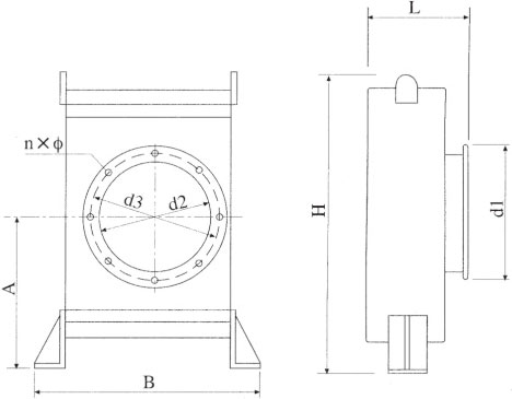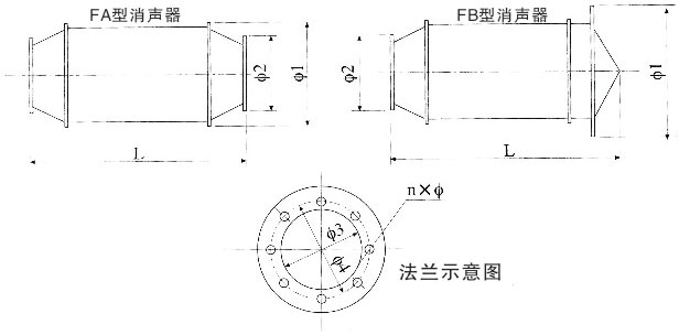 F型消聲器分為A、B兩種形式。A型兩端均為法蘭,可串接于管道中使用,B型一端是法蘭,另一端為防雨吸聲風(fēng)帽??晒┻M(jìn)、排風(fēng)使用。